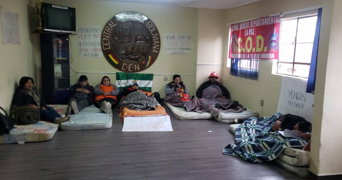 La Central Obrera Boliviana (COB) determinó radicalizar sus medidas de presión para exigir la abrogación del Decreto Supremo (DS) 5503, por ello instalaron tres piquetes de huelga de hambre que este martes cumplen su segundo día.