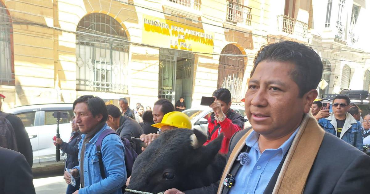 El candidato a la Gobernación de La Paz, Leopoldo Chui, llegó la mañana de este martes hasta a la Asamblea Legislativa Plurinacional para entregar un toro con el objetivo de financiar un referendo en el que se consulte la reducción de salarios de los legisladores nacionales.