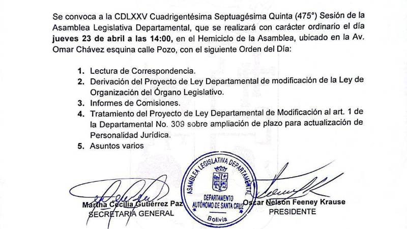 “Se convoca a la CDLXXV Cuadrigentésima Septuagésima Quinta (475°) Sesión de la Asamblea Legislativa Departamental, que se realizará con carácter ordinario el día jueves 23 de abril a las 14:00, en el Hemiciclo de la Asamblea, ubicado en la Av. Omar Chávez esquina calle Pozo” .