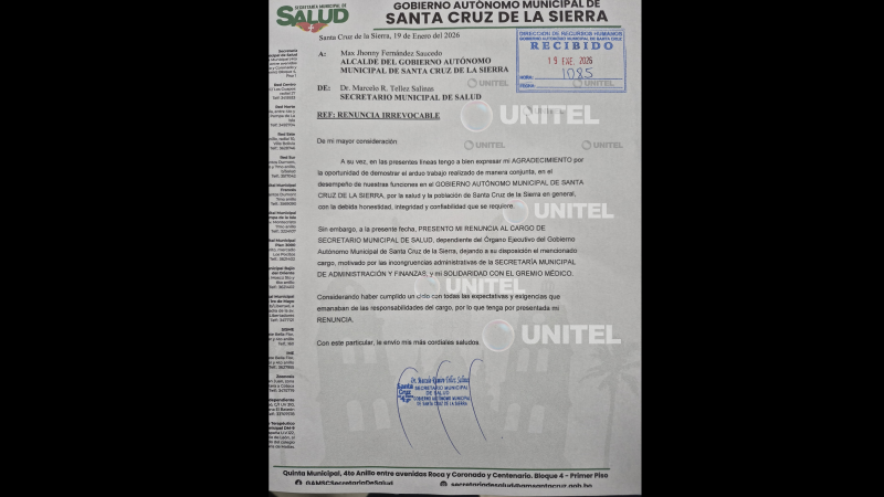 Secretario de Salud de la Alcaldía cruceña presenta su carta de renuncia