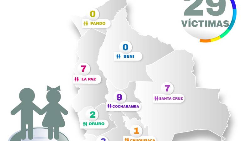 En cuanto a los casos de infanticidio, Bolivia cerró el 2025 con un total de 29 víctimas de infanticidio en 27 casos penales, lo que representa una reducción respecto a los 38 hechos regisLa Paz y Santa Cruz con 7 casos cada uno, 3 en Potosí, 2 en Oruro y 1 en Chuquisaca,trados el año 2024.
