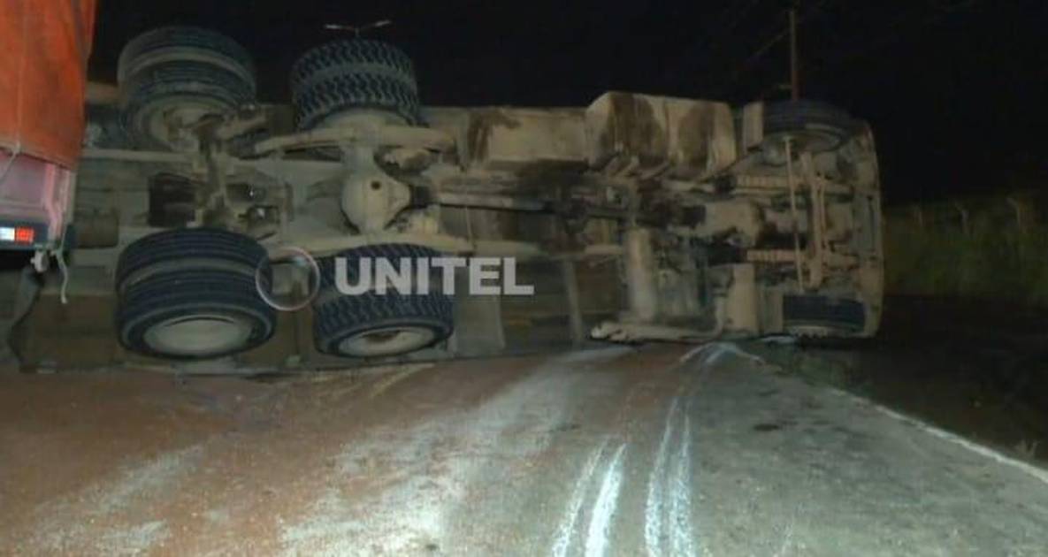 La carga quedó sobre el asfalto y dentro del camión estaba el chofer y una mujer quienes resultaron heridos y fueron trasladados en una ambulancia hasta un centro médico de Warnes.