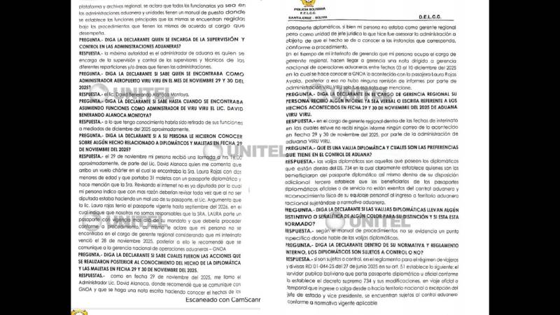 La declarante señaló que ese día, cerca de las 16:00, recibió una llamada del administrador David Alanoca, quien informó sobre la llegada del vuelo con Rojas, dos menores de edad y 31 maletas, según el documento al que tuvo acceso UNITEL de parte de la defensa de uno de los abogados de un funcionario de la entidad estatal.