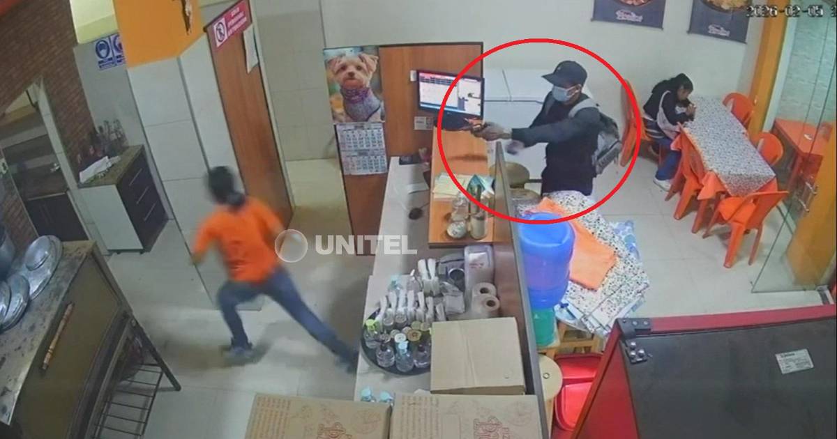 Un atraco a mano armada quedó registrado por las cámaras de seguridad de una pizzería ubicada en la zona de la avenida Tadeo Haenke y Villavicencio, en la ciudad de Cochabamba, hecho que sucedió la noche de este jueves.