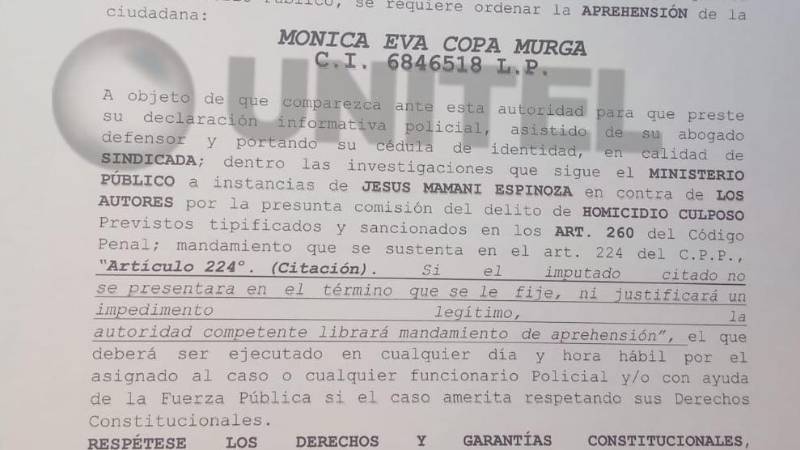 La Fiscalía de Achocalla ordenó la aprehensión de la autoridades edil el 11 de septiembre de este año, luego de que no se presentara al menos en cinco ocasiones, según el documento de esa instancia. Se conoce que la nueva citación es para este jueves 17 de octubre.