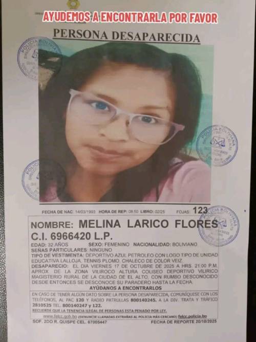 La profesora Melina Larico Flores asistió a un partido de fútbol en la ciudad de El Alto el viernes 17 de octubre y, desde entonces, tras un festejo, no se sabe más de ella.