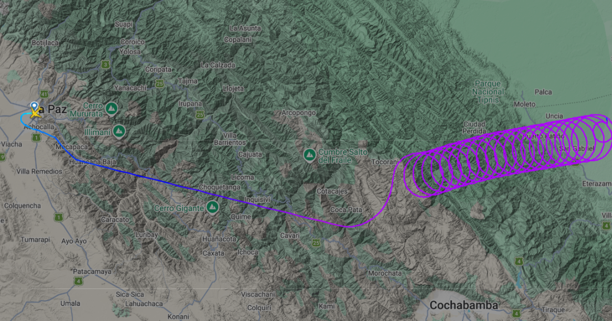 El portal Flightradar24.com, que expone en tiempo real los recorridos, da cuenta que la aeronave comenzó a registrar un vuelo circular cuando ingresó a espacio aéreo de Cochabamba.