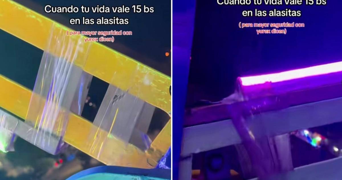 En un video publicado justo horas antes del accidente se muestra el uso de yúrex (cinta adhesiva) en este juego mecánico. Aunque, al parecer es para sostener las luces en uno de los soportes mecánicos. Las imágenes fueron compartidas por Majo, usuaria de Tik Tok, quien puso el texto “cuando tu vida vale Bs 15, (para mayor seguridad con yúrex, dicen)”.