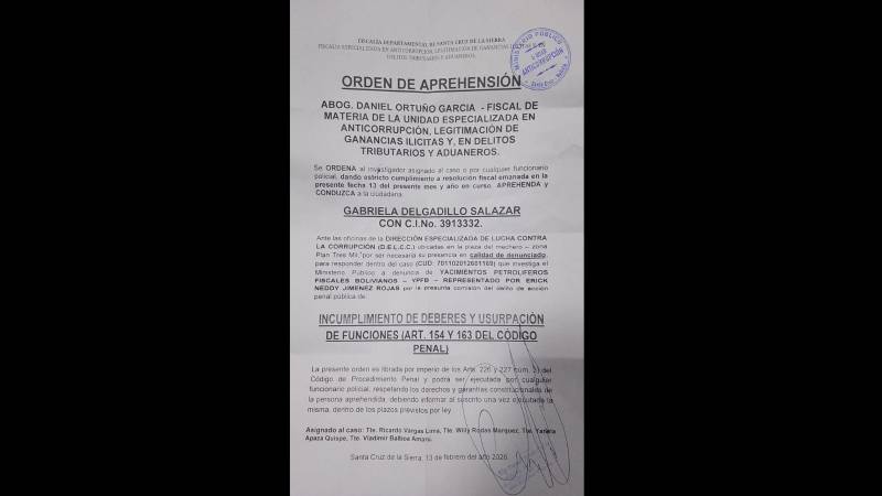 Tras la aprehensión de Gabriela Delgadillo, exgerente de Productos Industrializados y Derivados de Yacimientos Petrolíferos Fiscales Bolivianos (YPFB), la Fiscalía advirtió que la exejecutiva presuntamente incurrió en usurpación de funciones al firmar documentos como vicepresidenta de la petrolera estatal sin contar con esa designación.