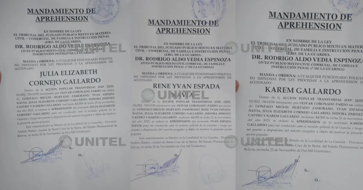 Son cuatro las ordenes de aprehensión que fueron emitidas por un juzgado de La Guardia que dispone la aprehensión de los magistrados Gonzalo Miguel Hurtado Zamorano, René Yván Espada Navia, Julia Elizabeth Cornejo Gallardo y Karem Lorena Gallardo Sejas.