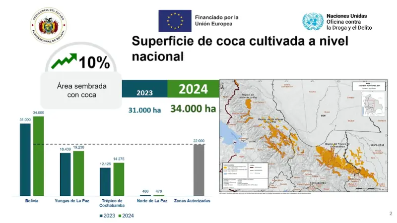 “En 2024, la región de Los Yungas de La Paz presentó un incremento de la superficie de cultivos de coca equivalente a un 4% (de 18.439 ha a 19.230 ha); de igual manera, la región del Trópico de Cochabamba presentó un incremento del 18% (de 12.125 ha a 14.275 ha). En contraposición la región del Norte de La Paz registró un decremento del 2% (de 486 ha a 478 ha)”, se añade.