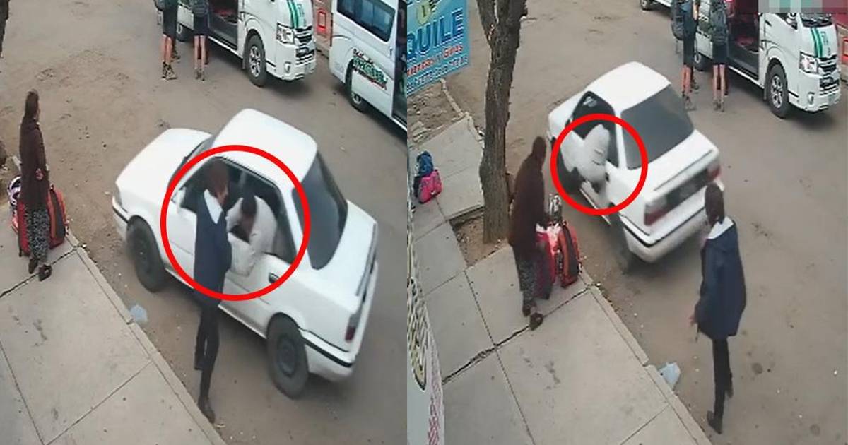 El vehículo se acerca a la víctima que estaba parada sobre la vía, la cual aparentemente piensa que se detendrá para llevarlas, pero es ahí donde de la ventana trasera sale un hombre y este procede a arrebatarle el bolso que llevaba en las manos.