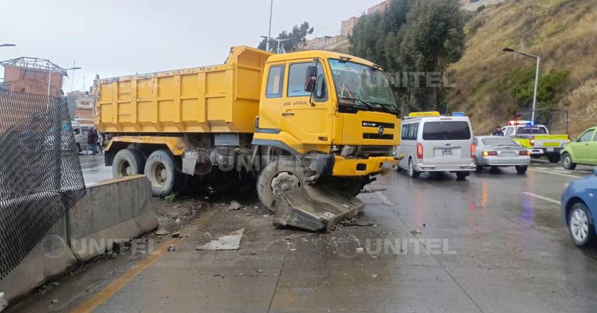 Este sábado, en plena lluvia, una volqueta impactó contra un minibús y los separadores viales, que quedaron destruidos, en la avenida la autopista que une las ciudades de La Paz y El Alto.