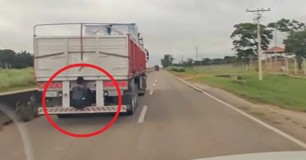 En el video se observa que el camión de alto tonelaje transitaba por la vía mientras que en la parte de atrás había un hombre vestido de negro y con una mochila, colgado de una barra que salía de la carrocería.
