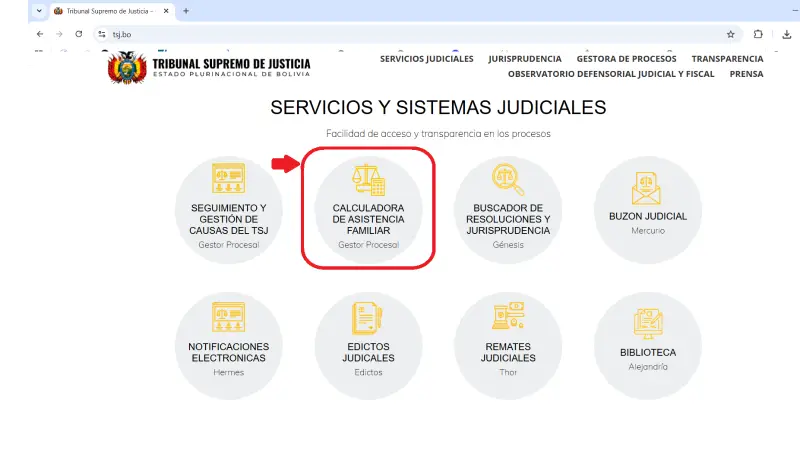 2.- Desplazarse a la sección de sistemas del Órgano Judicial y seleccionar la opción ‘Calculadora de asistencia familiar’ (en la misma página principal TSJ.bo).