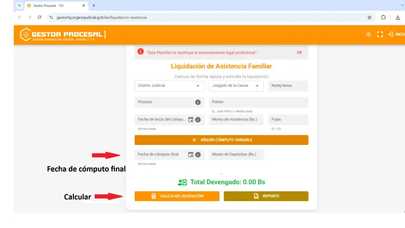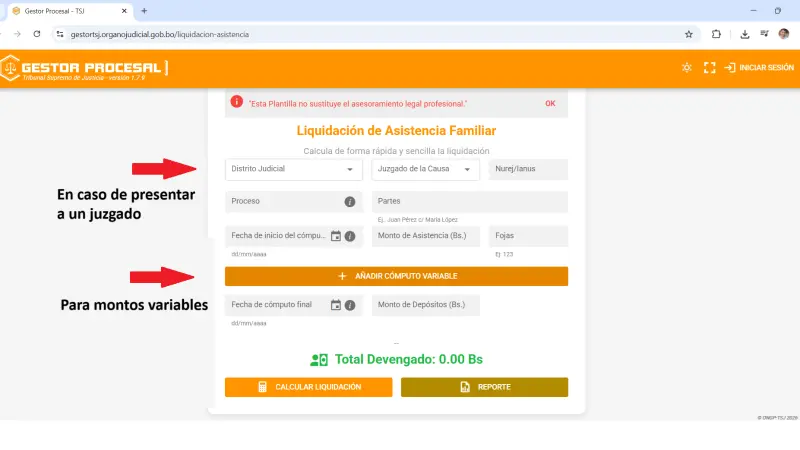- Para presentar el cálculo ante un Juzgado, se puede completar datos adicionales como distrito judicial, juzgado, número de causa, tipo de proceso y partes.