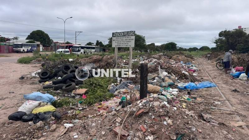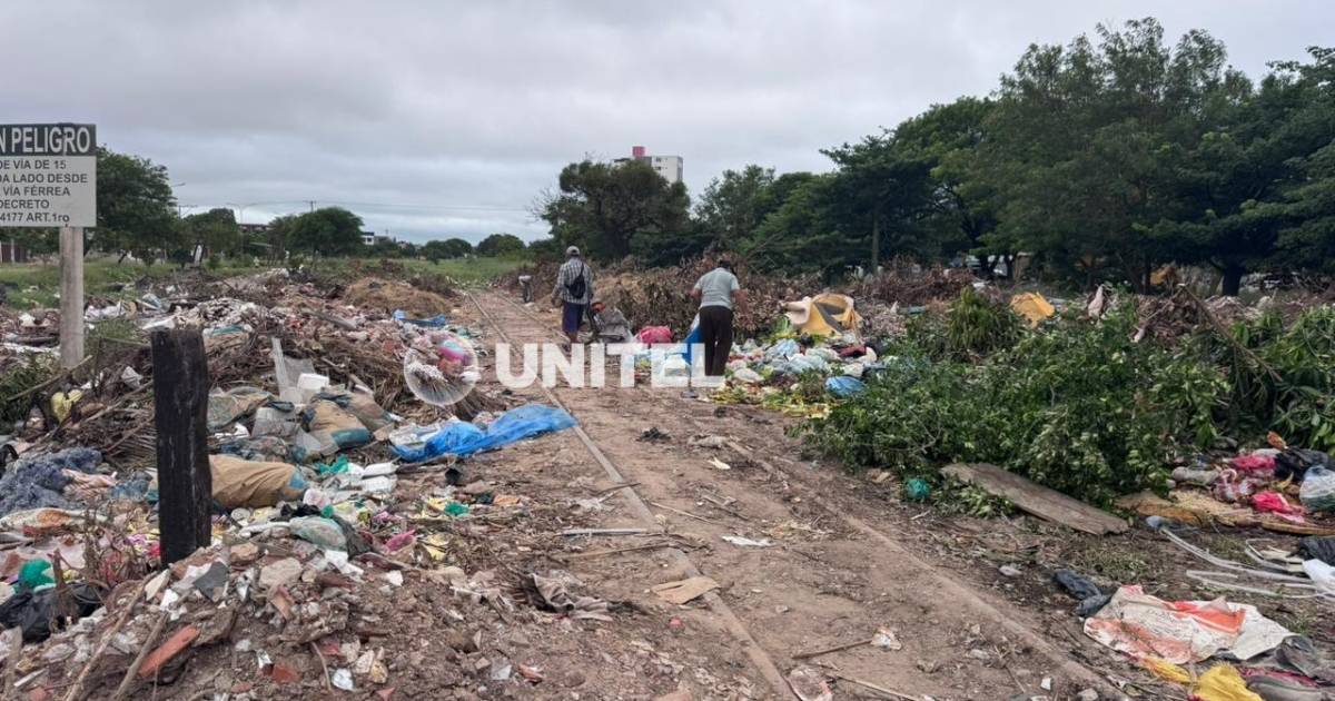 El basural está a los costados de las rieles del tren. Además, por un costado pasa un vehículo.
