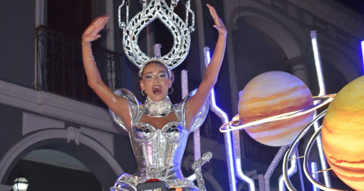 La soberana hizo su paso en un imponente carro que combina tonos azules y plateados, planetas y un cohete, recreando una auténtica nave espacial.