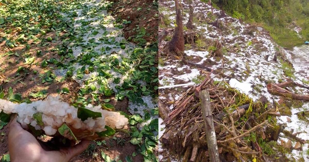 “Lo llamativo es que ha sido una granizada completamente súbita, de que no solamente ha destrozado, por decir, las hojas de los sembradíos, prácticamente el mismo fruto ha dejado en los suelos”, dijo Samuel Pereira, coordinador de Defensa Civil