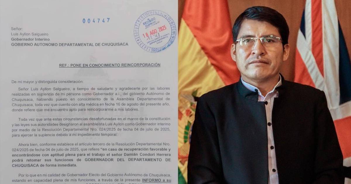 “A través de la presente informa a su persona mi reincorporación como Gobernador del departamento de Chuquisaca desde hoy lunes 18 de agosto”, indica la carca enviada al despacho del gobernador interino, Luis Ayllón.