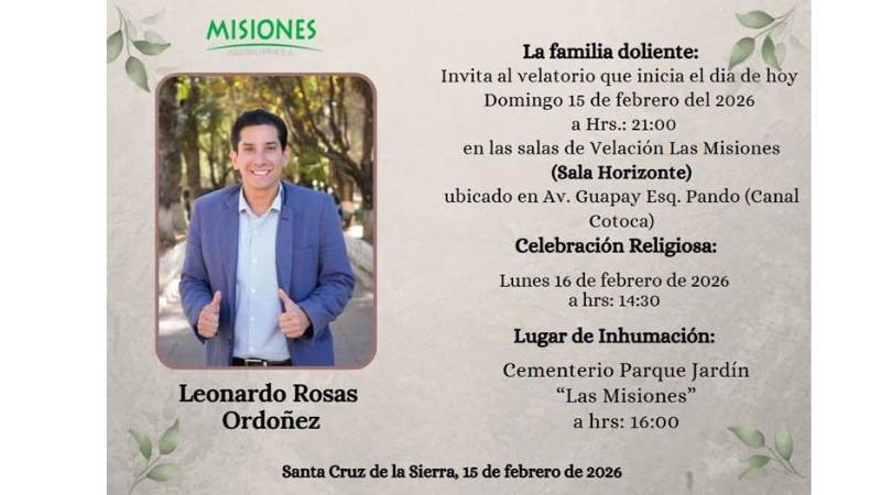 Según la publicación de la familia doliente, la celebración religiosa está prevista para las 14:30 del lunes 16 de febrero y, posteriormente, a las 16:00 se realizará la inhumación en el cementerio Parque Jardín Las Misiones.