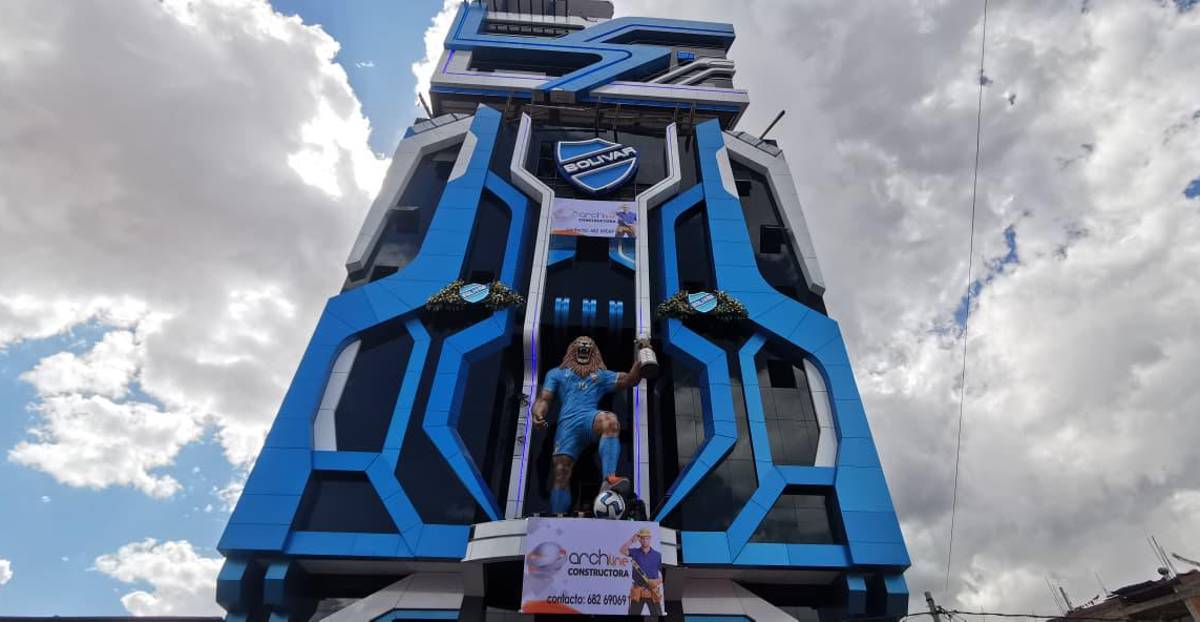 La impresionante edificación destaca por sus colores celestes con tonalidades blancas, característicos del Club Bolívar, además tiene una mascota gigante y helipuerto simulado en la parte superior.