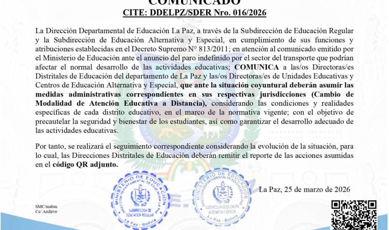 “Se comunica a los directores distritales del departamento de La Paz y los directores de las unidades educativas y centros de educación alternativa y especial, que ante la situación coyuntural deberán asumir medidas administrativas (Cambio de modalidad de atención a distancia)”, detalla un comunicado.