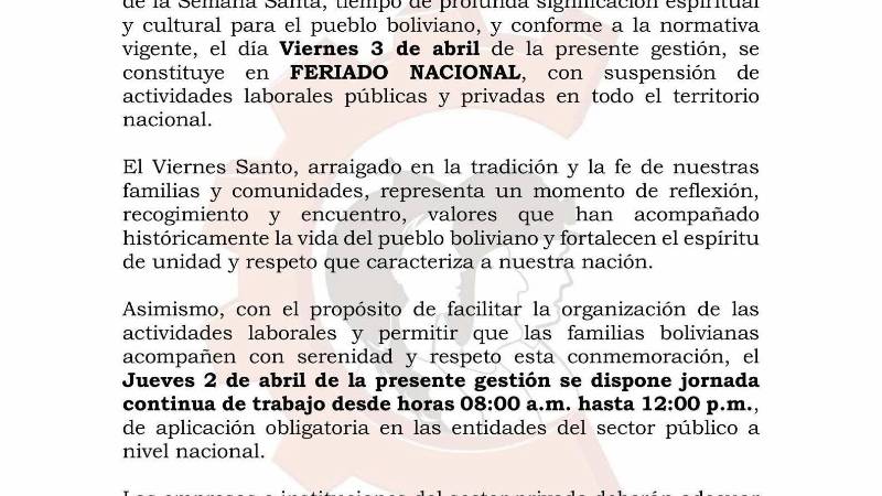 “En el marco de la conmemoración de la Semana Santa, tiempo de profunda significación espiritual y cultural para el pueblo boliviano, y conforme a la normativa vigente, el día Viernes 3 de abril de la presente gestión, se constituye en FERIADO NACIONAL, con suspensión de actividades laborales públicas y privadas en todo el territorio nacional”, señala el documento.
