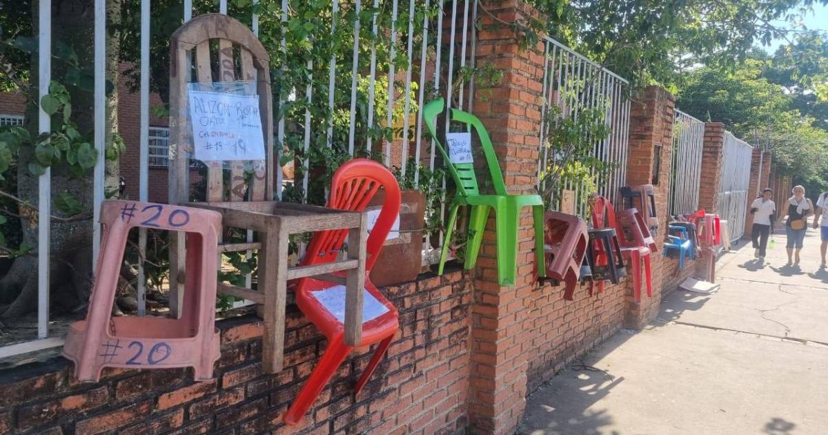 Padres amarran sillas en un colegio en busca de conseguir un espacio para la inscripción de sus hijos