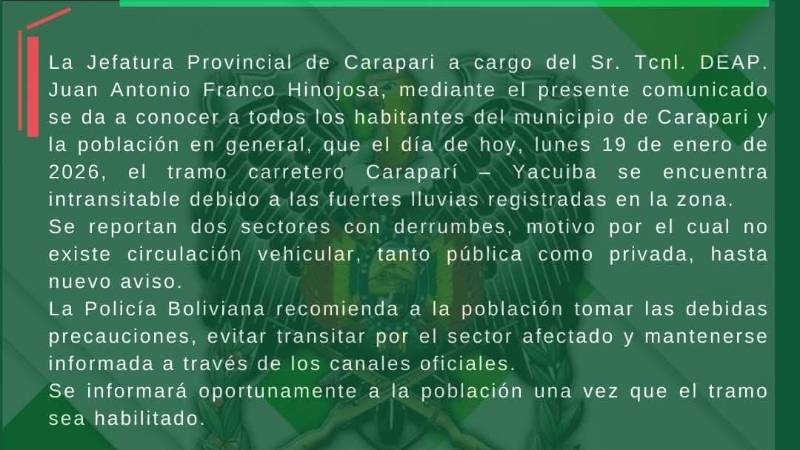 La Jefatura Provincial de Caraparí informó que el tramo carretero Caraparí – Yacuiba se encuentra “totalmente intransitable”, a consecuencia de las intensas lluvias registradas en la zona durante las últimas horas.