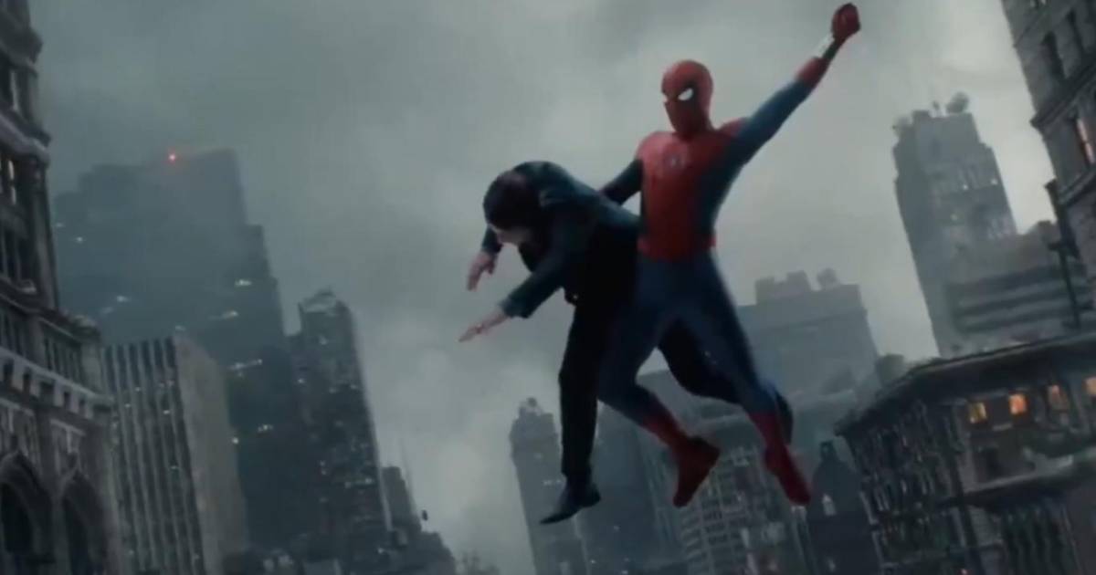 Un breve clip muestra a Tom Holland en acción con su traje icónico de superhéroe, mientras se balancea entre los edificios de Nueva York llevando a otro hombre en su brazo, en una escena cargada de acción.