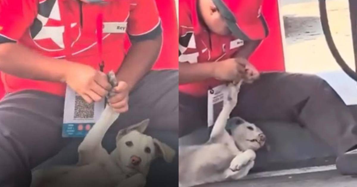 ¡Enternecedor! Trabajador de gasolinera le corta las uñas a un perrito callejero