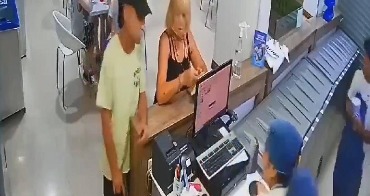 La cámara de videovigilancia del lugar registró el atraco donde se puede observar como el hombre se hace pasar por una persona que quiere hacer un pedido. En la escena se ve al malhechor al lado de una mujer que espera un pedido.