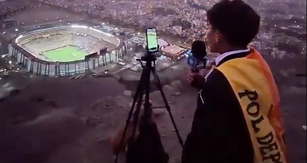 La curiosa imagen del adolescente vestido con traje (terno) y la bandera del Chankas atada al cuello a modo de capa retransmitiendo entusiasmado en las alturas el encuentro en Tiktok con tan solo un micrófono, un celular y un trípode llegó a aficionados brasileños y su video se hizo viral.