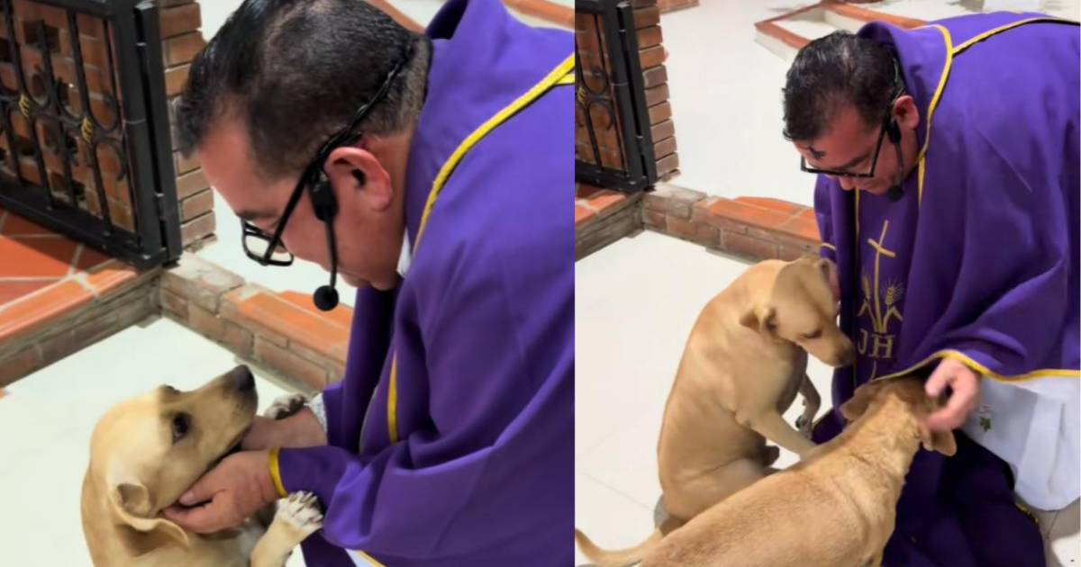 Un momento que refleja ternura, respeto por las mascotas y una demostración de empatía y amor hacia los animales. Después de la misa, él padre se da el espacio para repartir bendiciones en forma de caricias.