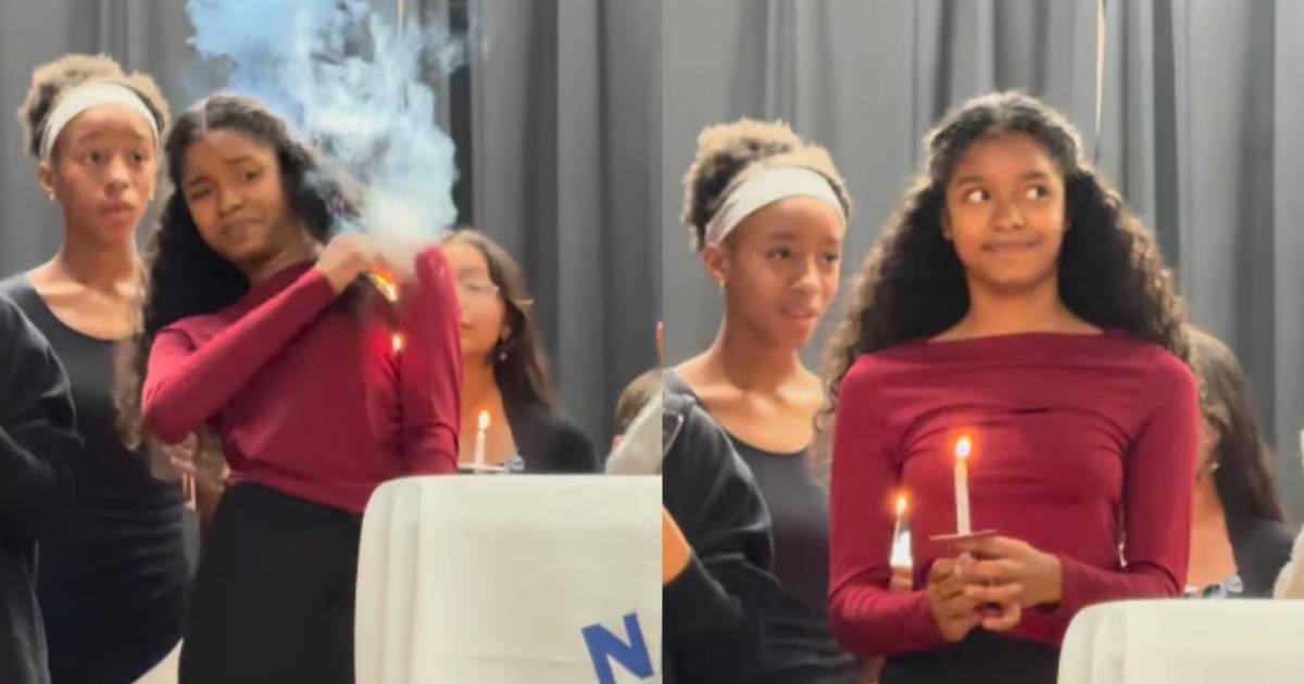 El incidente ocurrió durante una presentación escolar, accidentalmente la adolescente se quema el cabello con una vela y destaca la reacción que tuvo