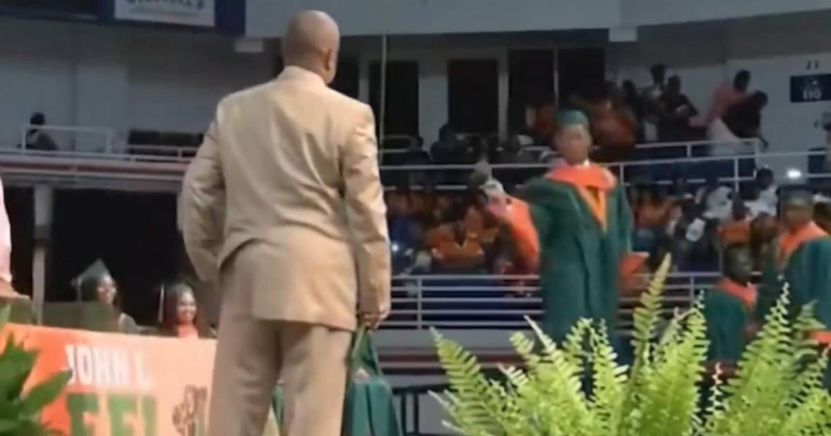 Un graduado fue obligado a repetir su entrada al escenario tras hacer un baile, pero su reacción inesperada generó aplausos y gritos