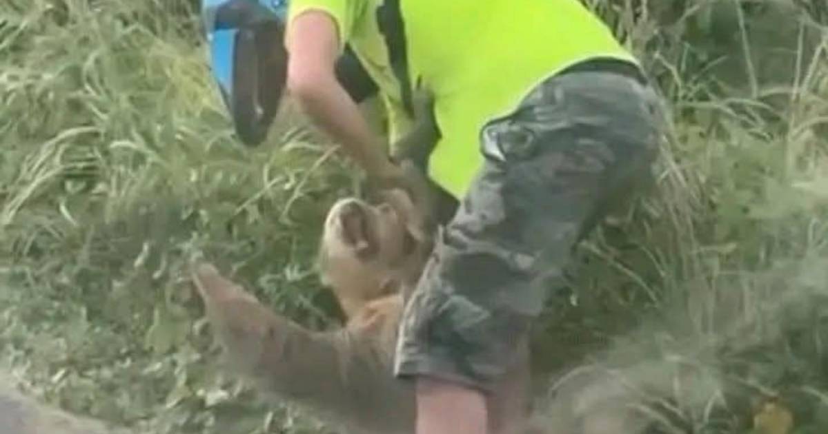 En las imágenes se observa cómo el hombre intenta alzar al animal desde su espalda y trasladarlo hacia un área verde cercana.