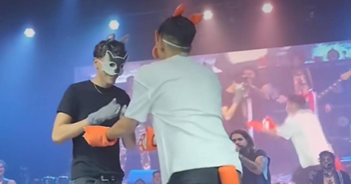 Dos jóvenes con máscaras de los animales con los que se identifican, sorprendieron al público al comprometerse en pleno show de la banda Argentina Nuestro Romance