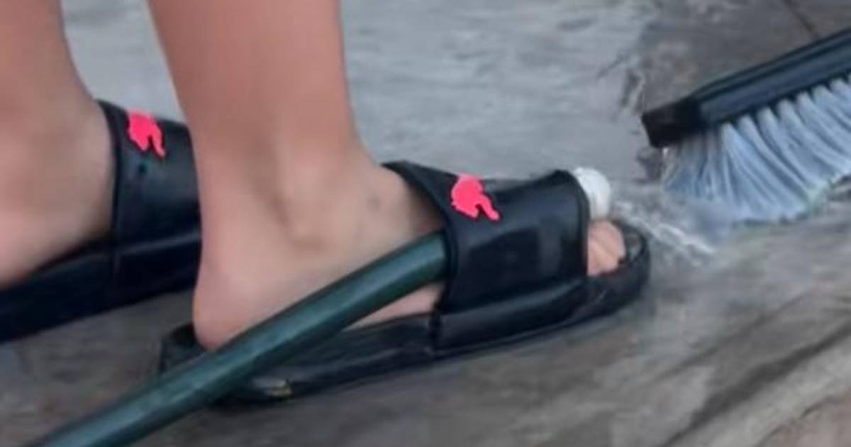 Se puede ver que la protagonista de este clip está con una escoba en la mano para realizar la limpieza y lo que sorprende es que tiene la manguera de agua en su pie, sujetada por su chinela.