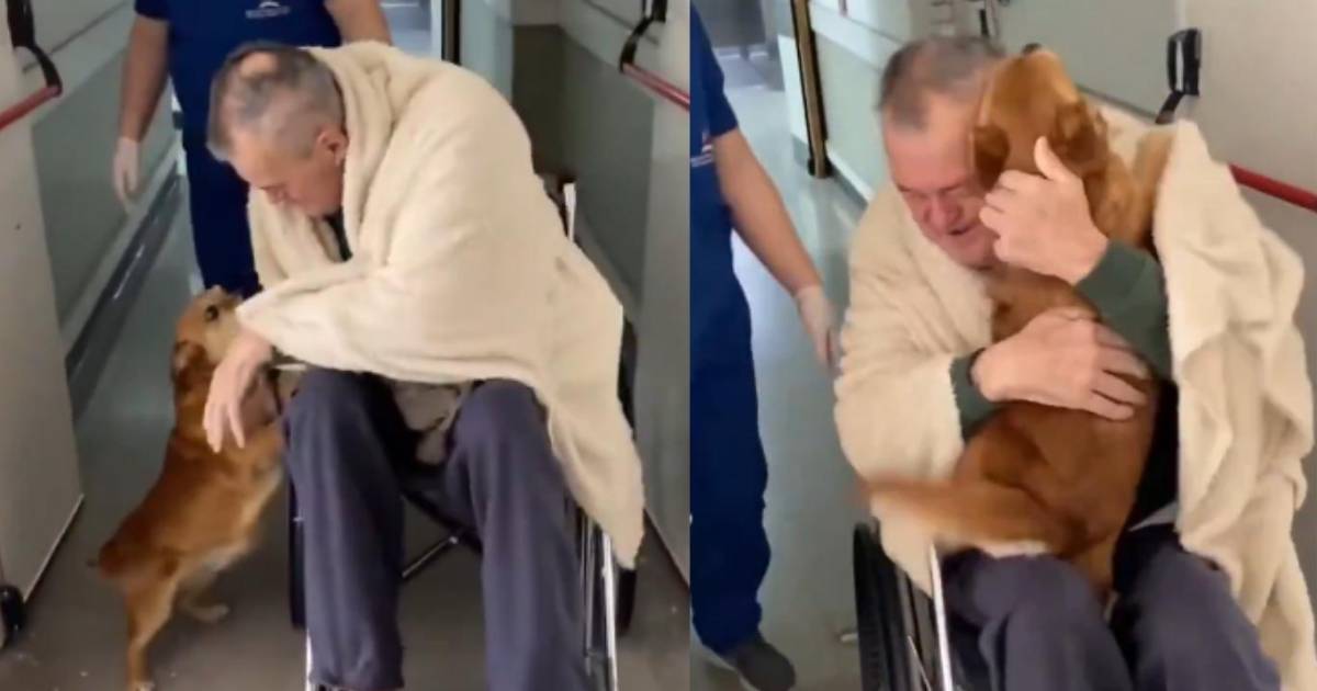 En el video se observa al anciano avanzando por un pasillo del hospital en una silla de ruedas, acompañado por personal médico. Al verlo, su perrito no puede contener la emoción: comienza a saltar, mover la cola sin parar y busca acercarse a su dueño.