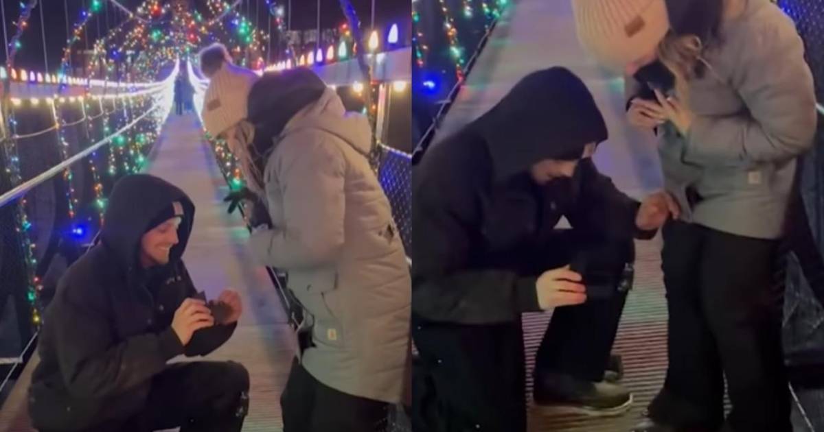 Un hombre eligió un escenario imponente para pedir matrimonio, lo hizo en SkyBridge Michigan, EEUU, el puente colgante con torres de madera más largo del mundo, sin embargo, el momento romántico se transformó en una escena de asombro cuando al intentar colocar el anillo en el dedo de su prometida, la joya se le resbaló de las manos y cayó por la rejilla del puente, precipitándose a más de 35 metros hacia la nieve.