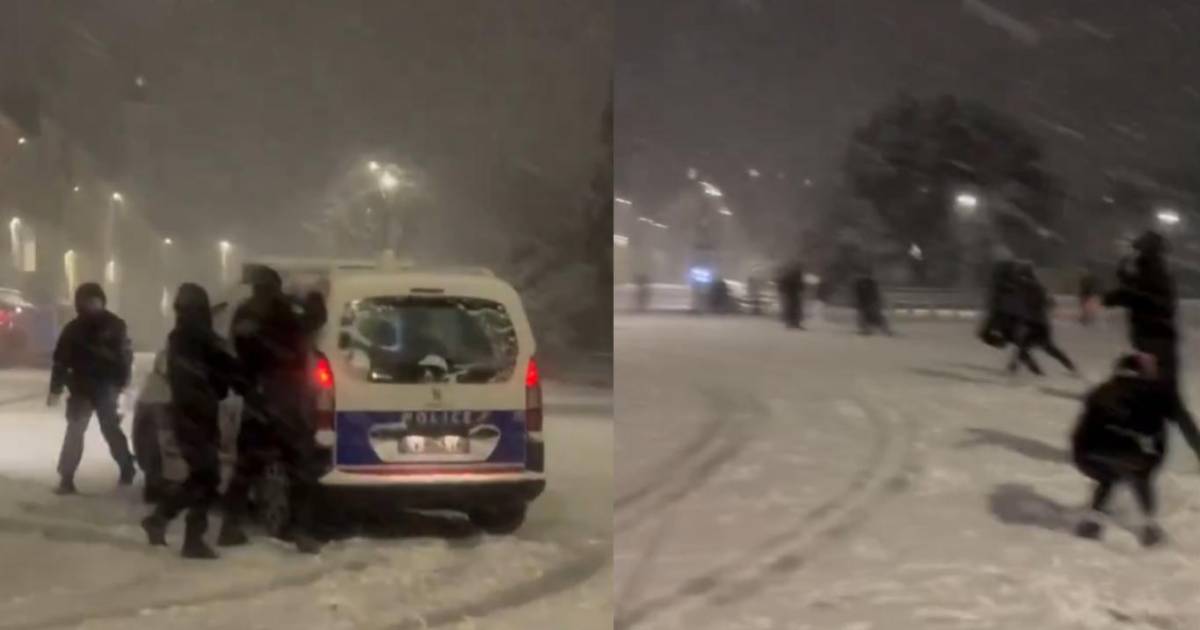 El post compartido por X muestra un video del 6 de enero de 2026, que captura a oficiales de policía municipales haciendo una pausa en su patrulla para unirse a jóvenes transeúntes en una pelea de bolas de nieve improvisada durante una noche nevada.