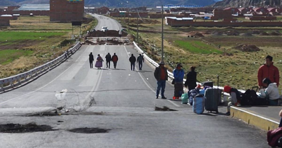 En esta zona del altiplano, en el sur del lago Titicaca, desde principios de enero campesinos impiden el tránsito por el puente internacional reclamando la renuncia de Dina Boluarte, quien asumió la presidencia de Perú en diciembre tras el fallido intento del mandatario Pedro Castillo de disolver el Congreso y gobernar por decreto.